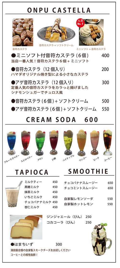 「音符カステラ」はCafe labo HAMADAのイチオシオリジナル商品として生まれました。 CDショップでもあるプラザハマダのイメージを音符に託して店主自ら毎日焼いています。 外からお買い求めしやすいようにテイクアウトコーナーも設けました。 まち歩きのお供にいかがでしょうか?